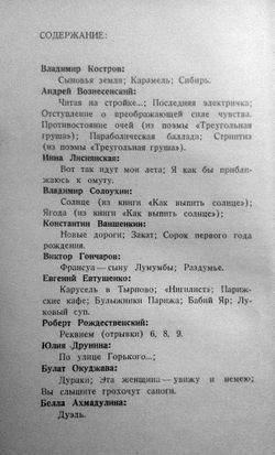 | Читая на стройке...; Последняя электричка; Отступление о преображающей силе чувства. Противостояние очей (из поэмы «Треугольная груша»); Параболическая баллада; Стриптиз (из поэмы «Треугольная груша»). |