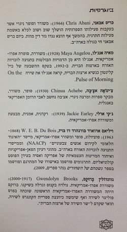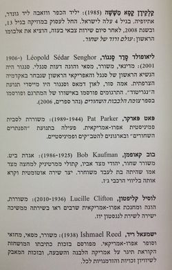 קישור לביקורת על הספר שמכילה ציטוטים משירים מאת לוסיל קליפטון (בתרגום אפרת ירדאי), צ'ינואה אצ'בה ואייבל מירופול (בתרגום נוגה שבח), וגיל סקוט הרון (בתרגום ערן צלגוב).