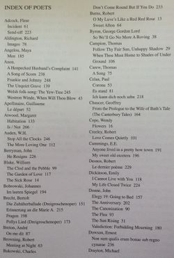 ויליאם בלייק: הרגב וחלוק-הנחל 99 / א. א. האוסמן: הוא לא חיכה 100 / רוברט קרילי: האהבה באה חרש 101 / תומס הרדי: מוג-לב בתחנת הרכבת 102 / ג'ון קיטס: La Belle Dame sans Merci / תומס קמפיון: בבוא יומך 106 / היינריך היינה: איני מאמין בשמים 107 / סר ג'ון סקלינג: שיר [אוהב טִפֵּש, למה הֶחֱוַרְתָּ] 108 / ויליאם מ. ת'קרי: ייסורי ורתר 109 / דורותי פרקר: שיר אהבה 110 / ו. ה. אודן: האוהב יותר 112 / קול פורטר: יום וליל 113 / רוברט הריק: לידידו - דברים בלתי-אפשריים 115 / סר תומס ואייט: סונטה [רוצה לצוד? אני צביה יודע] 116 / ויליאם בלייק: גן האהבה 117 / אמילי דיקינסון: לא אוכל לחיות איתך 118 / פיליפ לרקין: Annus mirabilis / היינריך היינה: הם שניהם אהבו זה את זה 123 / סטיבי סמית: ליל מנוחה 124 / פול (וגברת) מקרטני: עוד יום רגיל 125 / אנדרו מארוול: הגדרת האהבה 127 / סר פיליפ סידני: זֶמֶר 129 / ריינר מריה רילקה: שיר אהבה 130 / פול אלואר האוהבת 131 / ויליאם שקספיר: סונטה 116 132 / מרגרט אטווד: מגורים 133 / קורט שוויטרס: לאנא בלומה 134