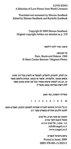ויליאם שקספיר: סונטה 29 189 / עדנה סט. וינסנט מיליי: סונטה 30 [האהבה היא לא הכֹל; היא לא] 190 / א. א. קמינגס: כלשהו חי בעיר כיצד קוֹרָא לה 191 / לואי מקניס: מתוך טרילוגיה ל-x / יוהנס בוברובסקי: בראי הריק 194 / א. א. קמינגס: דודה לוסי שלי הזקנה 196 / ברטולט ברכט: שאלות 198 / תומס הרדי: בימי "מפץ גויים" 199 / רוברט גרייבס: מונים את הפעימות 200 / ג'ון דון: יום השנה 202